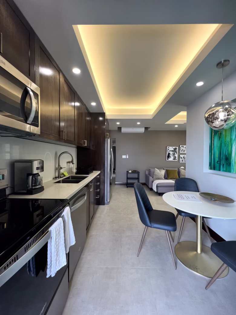 These fully furnished suites feature a private bedroom, modern bathroom, open-concept living space, and a fully equipped kitchen. Perfect for enjoying relaxed mornings or winding down after a day at the beach. Natural light, air-conditioned comfort, and contemporary finishes create a calm, welcoming space for your stay.